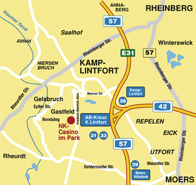 Hotel Casino im ParkWegbeschreibungAuf der A 42 / A 57 bis zum Autobahnkreuz Kamp-Lintfort, an der Abfahrt rechts Richtung Kamp-Lintfort, an der Ampel links Richtung Gewerbegebiet Ost (Moerser Str.), nach 2 km an der Ampel links Richtung Gewerbegebiet Süd (Heinrichstr.), nach ca. 300m an der Ampel links (Friedrich-Heinrich-Allee), nach ca. 300m liegt unser Hotel auf der rechten Seite.Auf der A 40 bis zur Abfahrt Neukirchen-Vluyn, an der Abfahrt rechts Richtung Neukirchen-Vluyn, auf der Landstrasse ca. 6 km geradeaus Richtung Kamp-Lintfort, das Hotel liegt ca, 1 km hinter dem Ortsschild auf der linken Seite.EntfernungDüsseldorf Messe, 38 kmEinkaufszentrum CentrO in Oberhausen, 20 kmDuisburg, 20 kmVenlo, 35 km